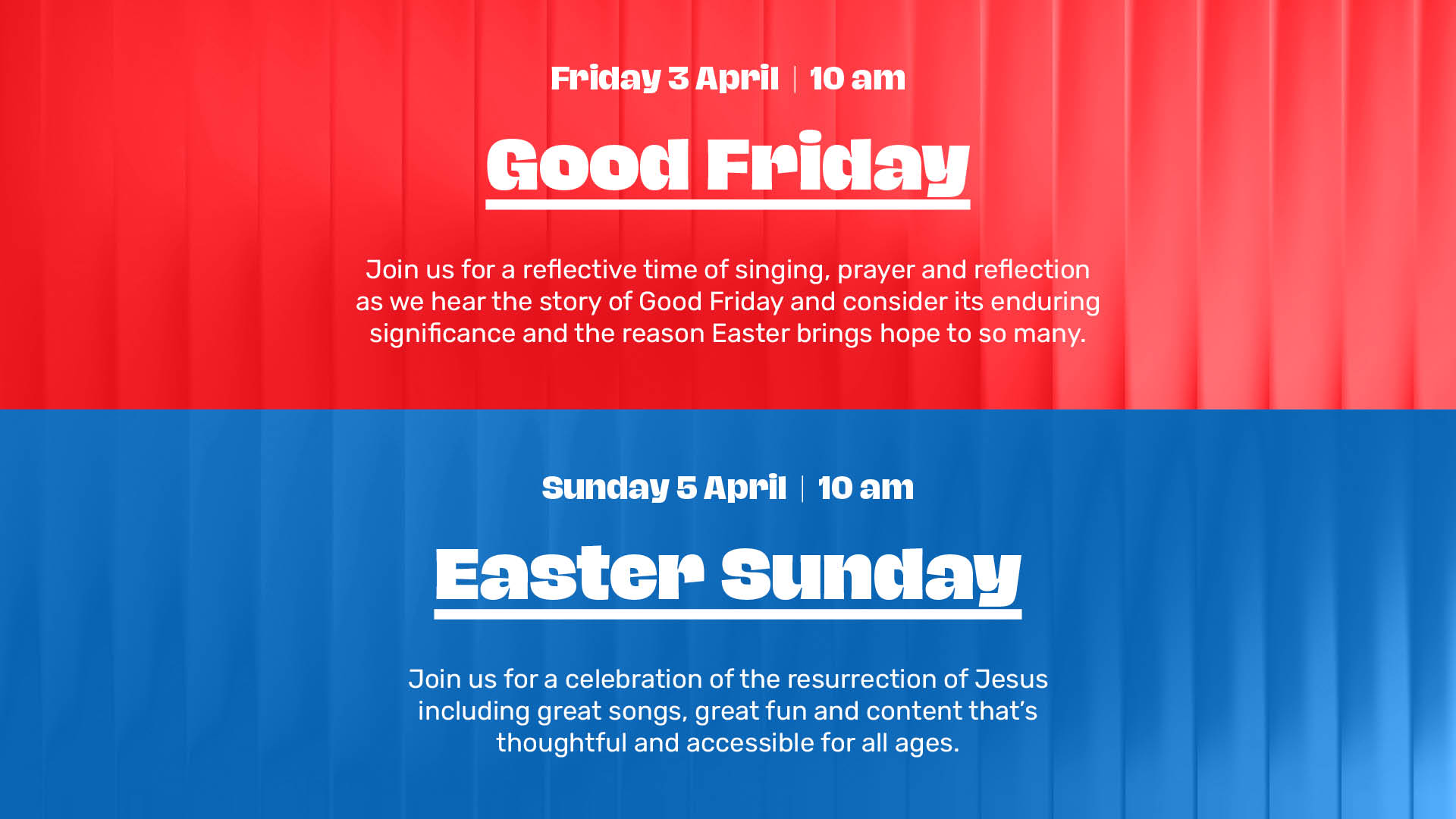Join us for a celebration of the resurrection of Jesus including great songs, great fun and content that’s thoughtful and accessible for all ages.